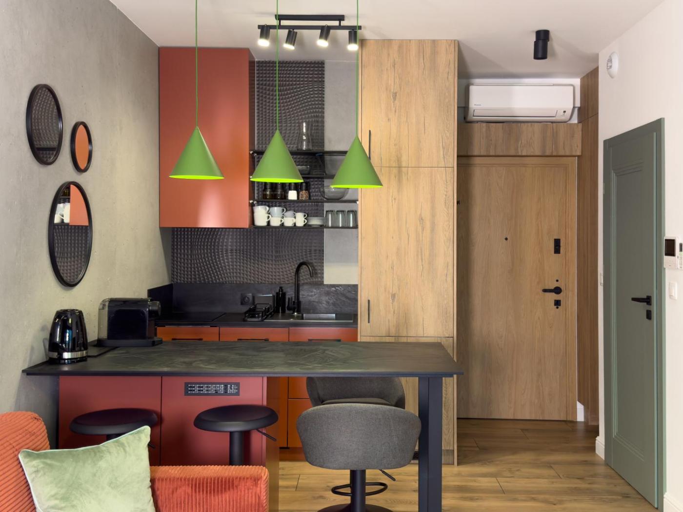 Apartament z 1 sypialnią. This air-conditioned apartment consists of 1 living room, 1 separate bedroom and 1 bathroom with a shower. Meals can be prepared in the kitchenette, which is equipped with a stovetop, a refrigerator, a dishwasher and kitchenware. The apartment features tiled floors, a seating area with a flat-screen TV, a washing machine, a tea and coffee maker as well as city views. The unit offers 2 beds. Apartament - 4 osobowy. Powierzchnia pokoju ok.: 44 mkw.