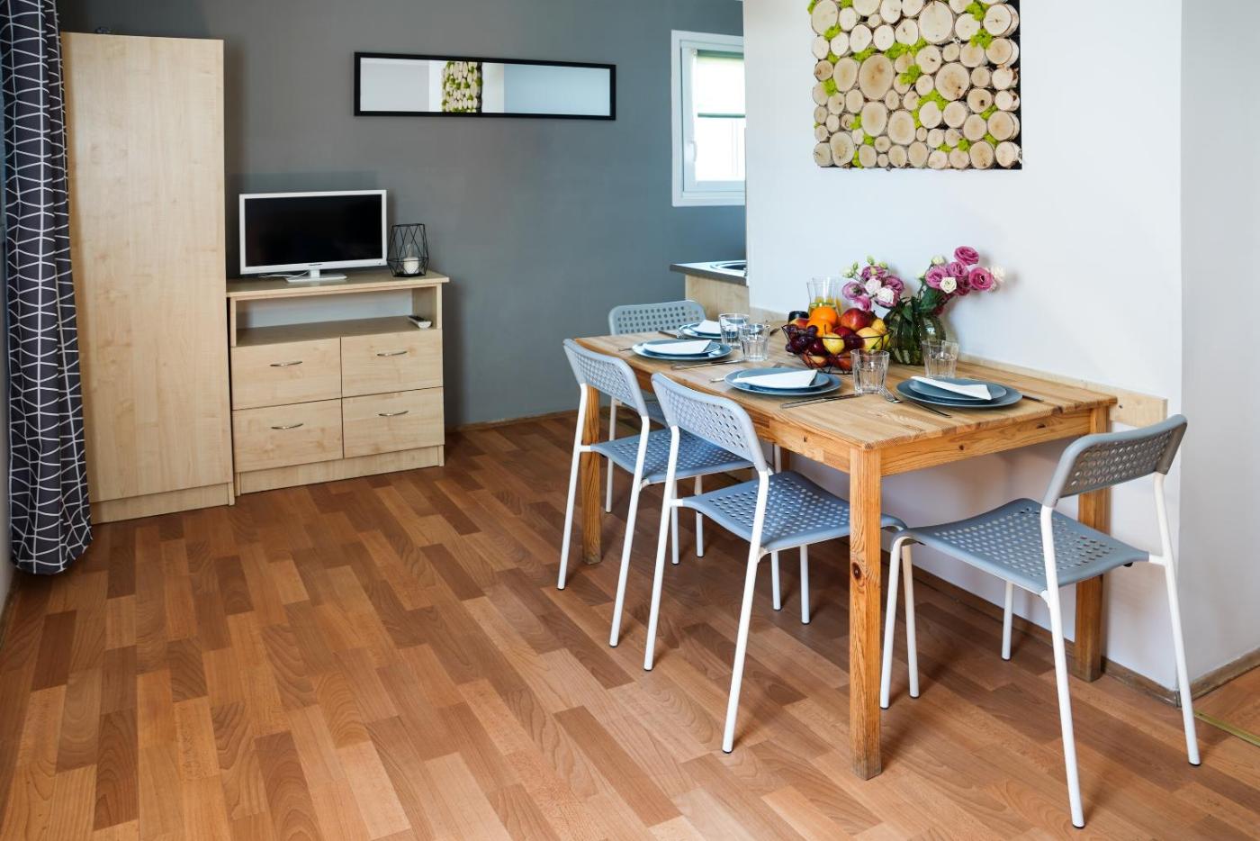 Bungalow. Featuring a private entrance, this bungalow comprises 1 living room, 1 separate bedroom and 1 bathroom with a shower. Meals can be prepared in the well-fitted kitchenette, which comes with a refrigerator, kitchenware and an electric kettle. Boasting an outdoor dining area, this bungalow also provides a dining area, a wardrobe and a flat-screen TV. The unit offers 2 beds. Bungalow - 6 osobowy. Powierzchnia pokoju ok.: 30 mkw. ;